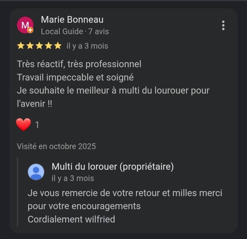 j’accorde une importance capitale à l'écoute de mes clients et à leur satisfaction. Chez Sarl Multi Du Lorouer, chaque projet est une collaboration où vos besoins et vos attentes sont au centre de mes préoccupations. Découvrez comment je transforme vos idées en réalité, avec un engagement constant envers la qualité et le respect de vos exigences.